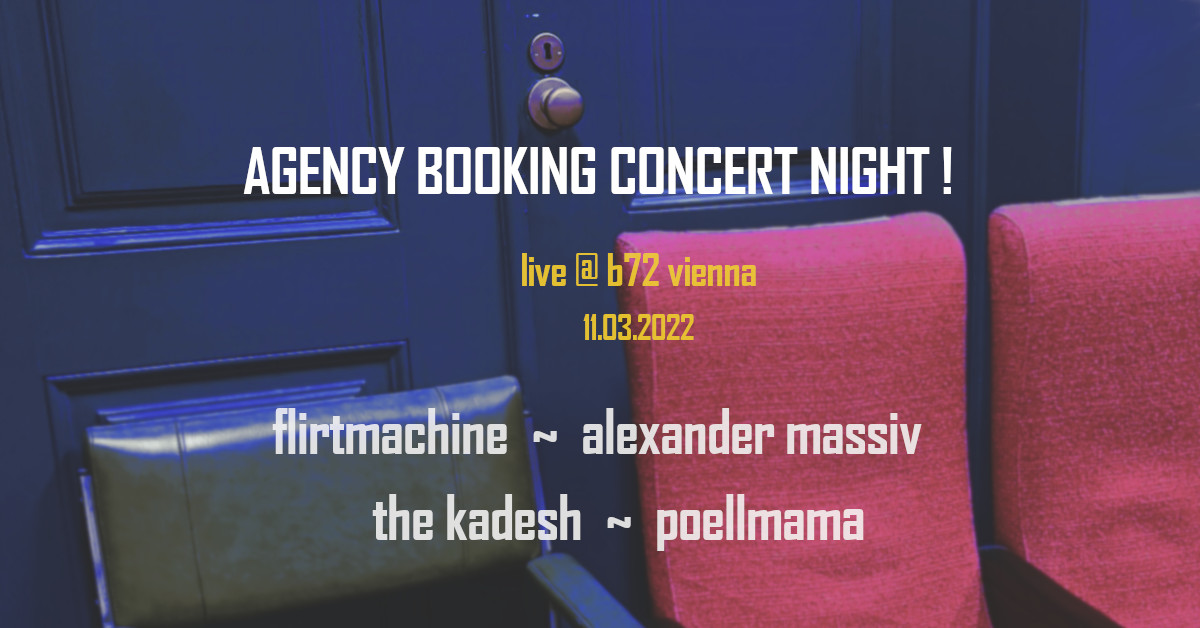 four rarely talked-about austrian underground bands will take the b72 stage to show the great music they have been working on, and will take you on a wild ride into the mysterious and surfacing world of 'agency booking' - a booking agency making it's concert night debut on march 11 2022.