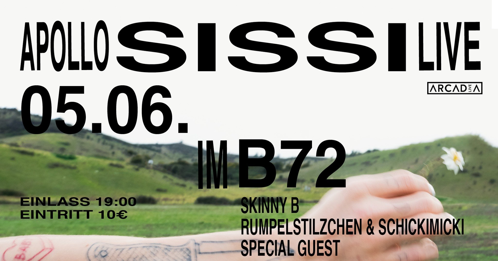 Apollo Sissi Album Release Konzert gemeinsam mit Skinny B und Special Guests. Danach Technoparty von Rumpelstilzchen und Schickimicki. Lasst uns den Sommerbeginn feiern